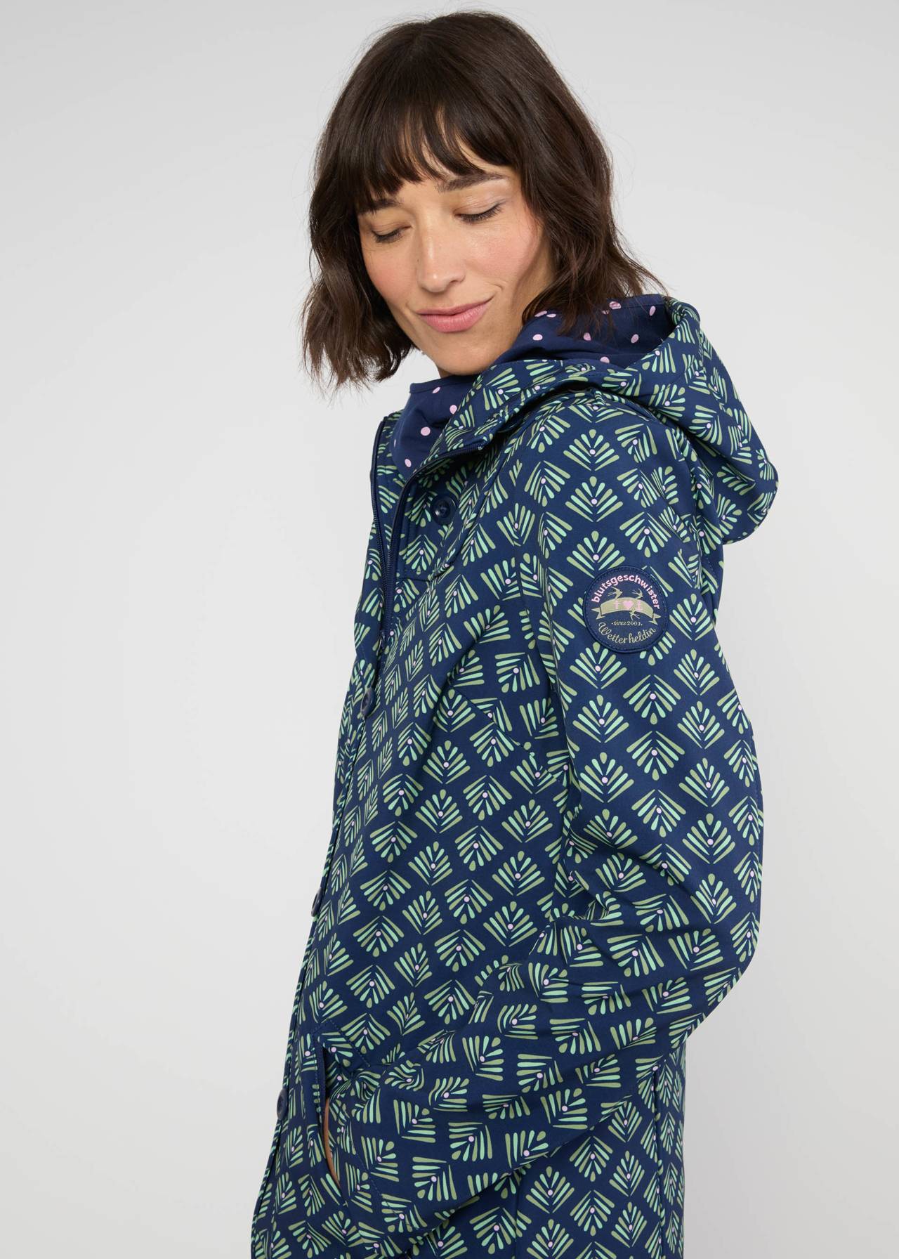 00 mm Wassersäule) dich zuverlässig trocken hält. Die warme Fleece-Innenseite aus zertifiziert recyceltem Polyester schenkt extra Komfort. Praktische Details wie 2-Wege-Reißverschluss mit Windabdeckleiste und Kinnschutz, ergonomisch geformte Zipper sowie Corozo-Knöpfe aus nachwachsendem Material unterstreichen die Funktionalität. Die Passform ist lässig und oberschenkellang – ideal, um sie über Strick, Hoodie oder Blazer zu tragen. Ob für den Weg ins Büro, den Stadtbummel oder ausgedehnte Spaziergänge: Dieser Mantel verbindet Nachhaltigkeit, Funktion und modernes Design zu einem Essential für kalte Tage.