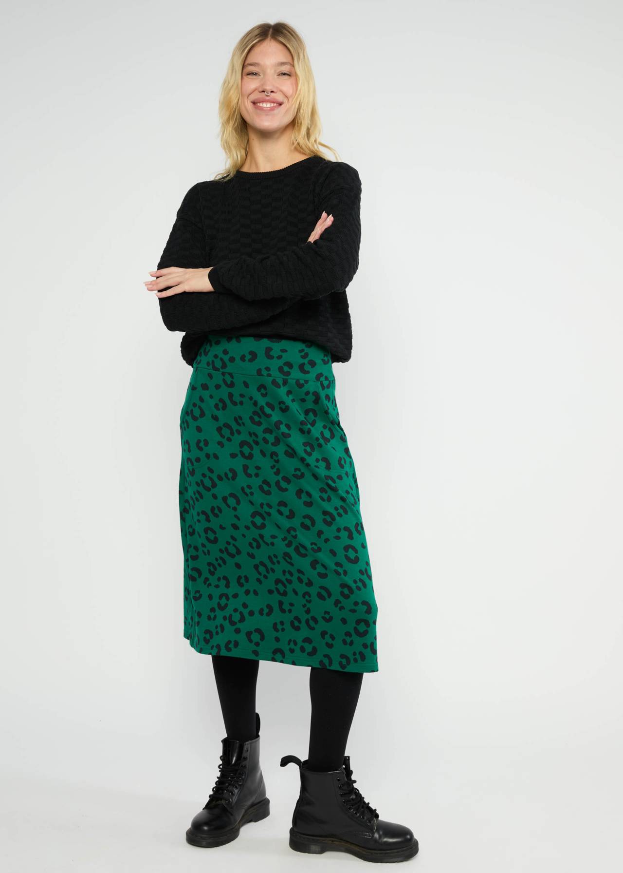 Ein Rock, der mit dir geht: Dieser wadenlange Midirock aus anschmiegsamem Bio-Baumwoll-Interlock mit 5 % Elasthan bietet sanften Halt, wärmt angenehm und bleibt zuverlässig in Form. Die leicht ausgestellte A-Linie schwingt bei jedem Schritt, ein komfortabler, feminin geformter Bund sitzt entspannt in der Taille.