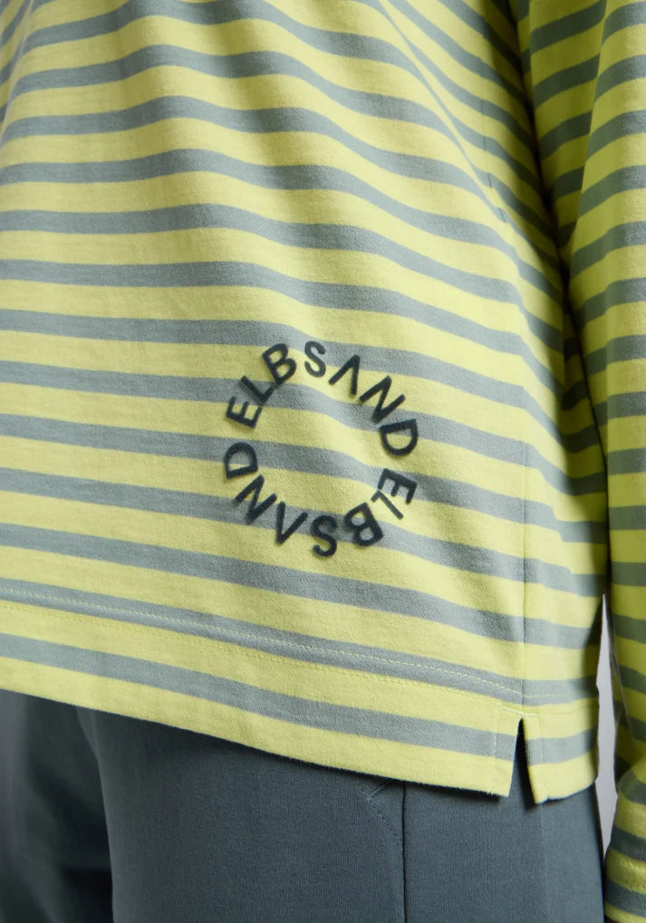 Der Bootsausschnitt bringt eine feminine Note in den Look und lässt sich super mit Ketten oder Tüchern kombinieren. Auf der Vorderseite setzt ein weicher Flockprint dezente Akzente, die den typischen Elbsand-Style unterstreichen. Ob zu Jeans, Shorts oder Jogpants – das gestreifte Longsleeve passt einfach immer.