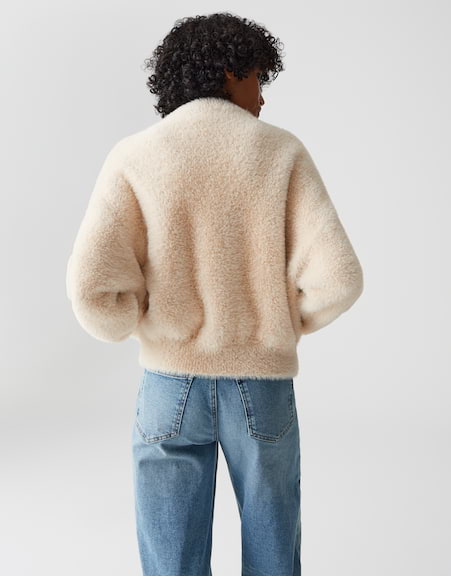 Im leicht oval geschnittenen Blousonstil begeistert diese Strickjacke aus softem "Eyelash" Effektgarn, das an zartes Kunstfell erinnert. Mit feiner, haariger Struktur wird sie im Handumdrehen zum absoluten Highlight jeder Garderobe.