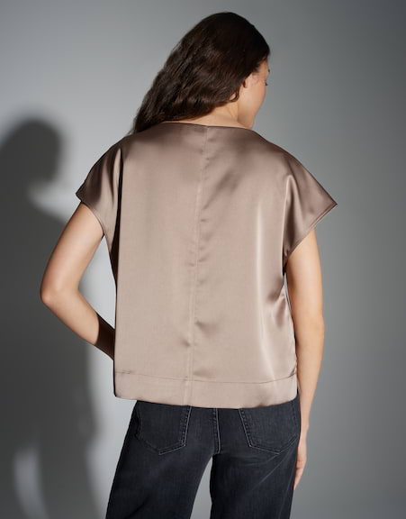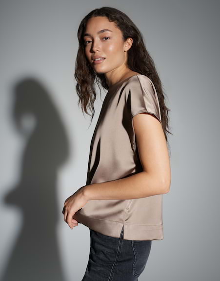 Satin trifft auf minimalistischen Chic. Die fließende Shirtbluse lässt sich mühelos mit der passenden Wide Leg Pants kombinieren und zaubert so ein glänzendes Outfit für besondere Anlässe.