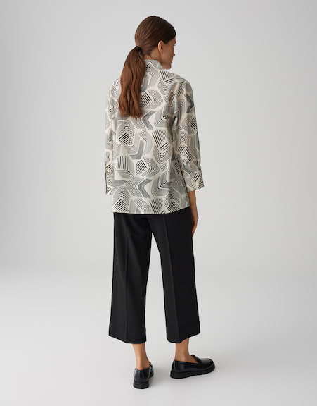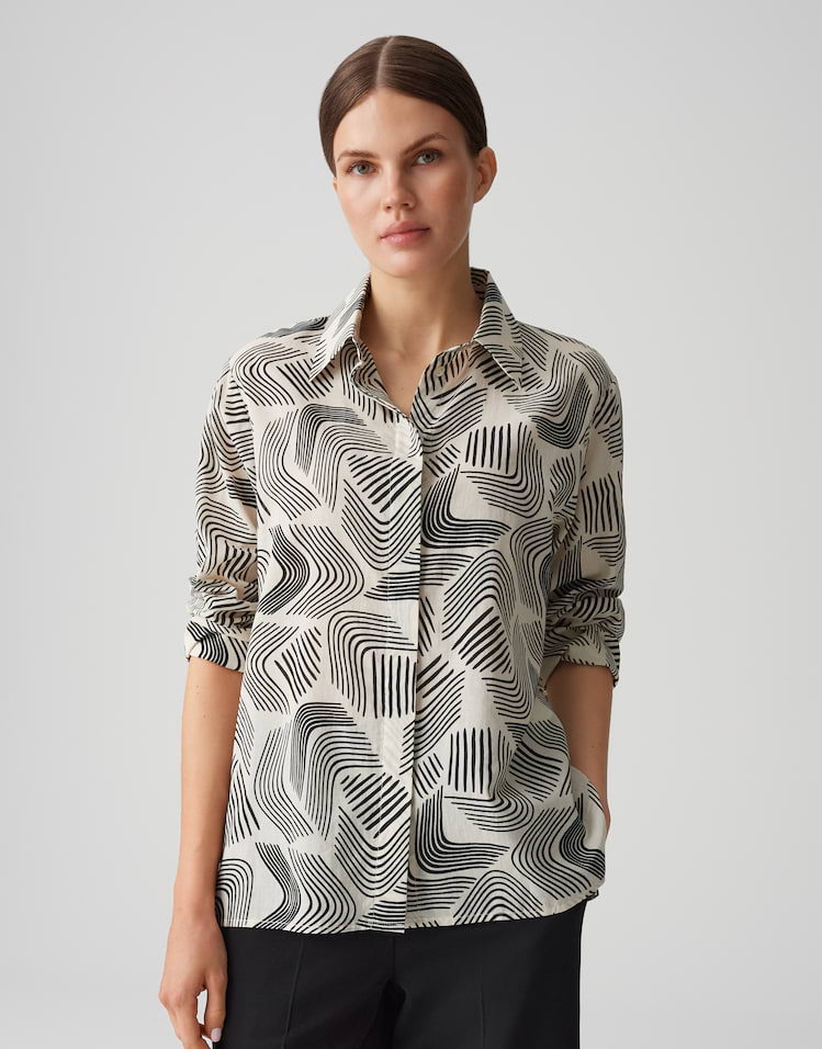 | lockere Passform, leicht ausgestellter Schnitt, hinten länger als vorne, verkürzter Arm, Hemdblusenkragen, Rückenlänge ca. 71 cm bei Größe 36, Farbe coal blue: Model Größe 172 cm ? trägt Größe 36, Farbe natural glaze: Model Größe 175 cm ? trägt Größe 36, Webware, enthält nichttextile Teile tierischen Ursprungs, leichter Stoff, fließender Fall, All-Over-Print, verdeckte Knopfleiste, Perlmuttknöpfe, klassische Manschetten | |