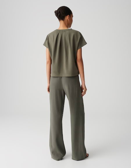 | weite Passform, Boxy Fit, verkürzte Länge, überschnittener Kurzarm, Rundhalsausschnitt, Rückenlänge ca. 56 cm bei Größe 36, Model Größe 175 cm ? trägt Größe 36, Sweatware, weicher Griff, samtige Oberfläche, Faltendetail am Rücken | |