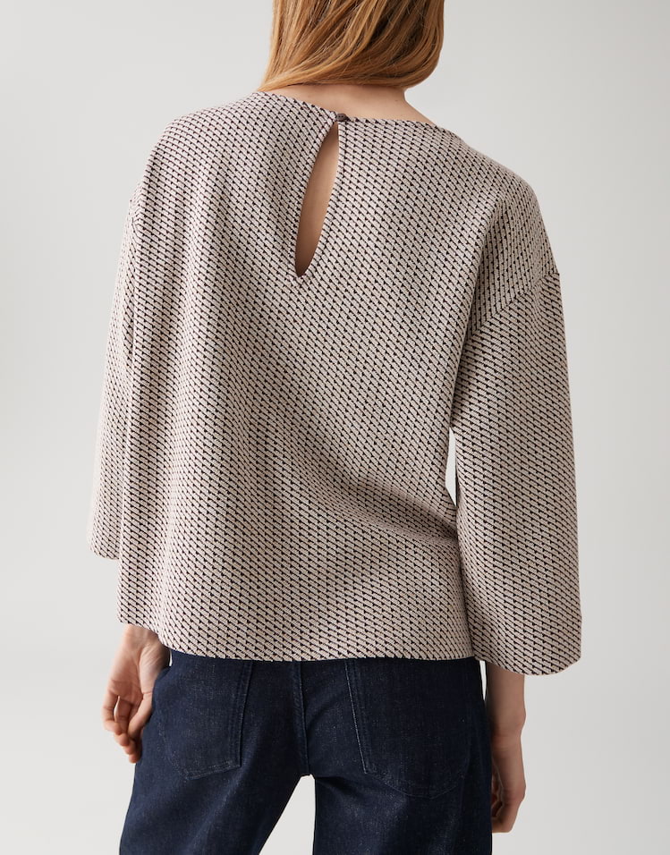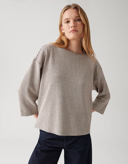 weite Passform, gerader Schnitt, überschnittene Schulter mit 3/4 Arm, U-Boot-Ausschnitt, Rückenlänge ca. xx cm bei Größe 36, Model Größe 178 cm ? trägt Größe 36, Sweatware, natürlicher Griff, fließender Fall, Knopf mit Öse, Schlitz im Rücken | |