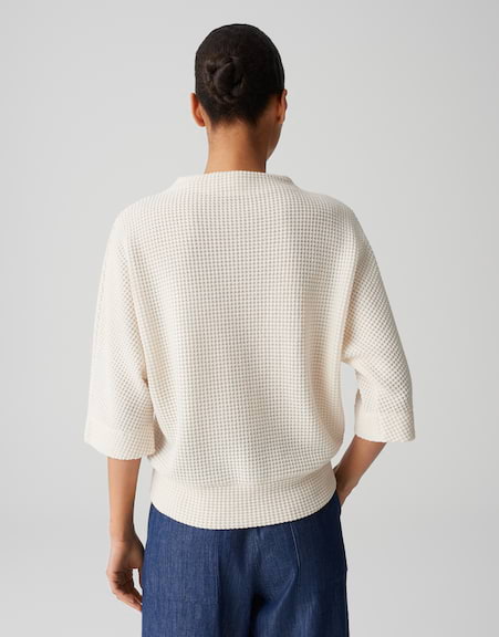 | lockere Passform, schmal zulaufend, überschnittener 3/4 Arm, Funnel Neck, Rückenlänge ca. 58 cm bei Größe 36, Model Größe 177 cm ? trägt Größe 36, Sweatware, Lochstrukur, weicher Griff, leichte Transparenz, breiter Saum | |