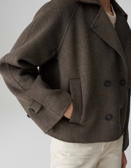 Urban Chic Trenchcoat überzeugt als doppelreihige Kurzjacke aus supersofter Double Wollmixqualität, dessen handgestitchte Nähte seine Hochwertigkeit unterstreichen, während die ungefütterte A-Linie lässig feminine Eleganz ausstrahlt.
