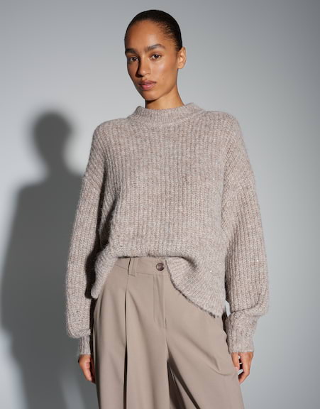Weicher Strickpullover mit feinem Rippstrickmuster überzeugt durch den spannenden Mix aus metallisch glänzendem Lurex und zarten Pailletten, die dem Design dezenten Glanz verleihen.