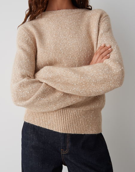normale Passform, schmal zulaufend, Langarm, Funnel Neck, Rückenlänge ca. 55 cm bei Größe 36, Model Größe 177 cm ? trägt Größe 36, Strick, Bouclé Struktur, natürlicher Griff, wärmend, Strickbündchen, Mélange-Effekt | |