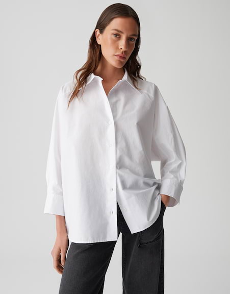 Ein Klassiker, neu interpretiert! Die oversized Longbluse aus nachhaltigem Baumwollpopelin bringt mit weiter A-Linie und Raglanärmeln eine moderne Leichtigkeit – lässig offen getragen oder als Statement Piece gestylt.