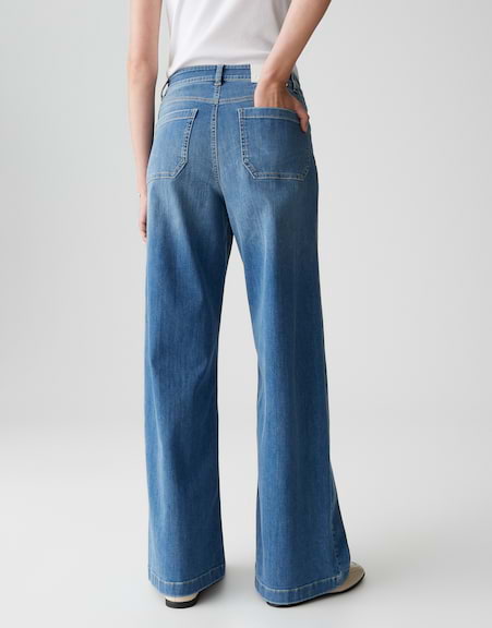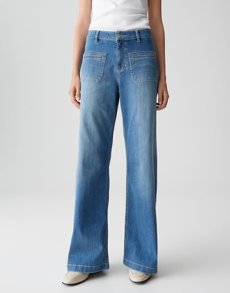 Die Palazzo Jeans mit weitem Bein und markanten Taschen präsentiert sich in lässiger Mid Blue Waschung und lässt sich ideal mit einem schlichten Top und Loafern kombinieren. So entsteht ein moderner City Look, der Stil und Komfort vereint.