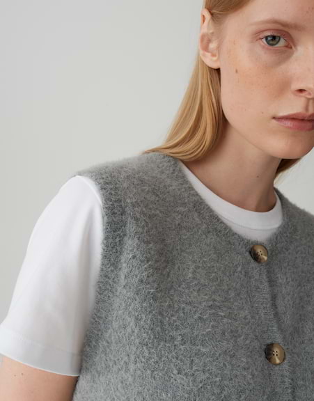 Die Strickweste aus flauschig weichem Strick und dezenter Melange Optik ist der perfekte Begleiter zu Denim und bringt lässigen Komfort in jeden Look.