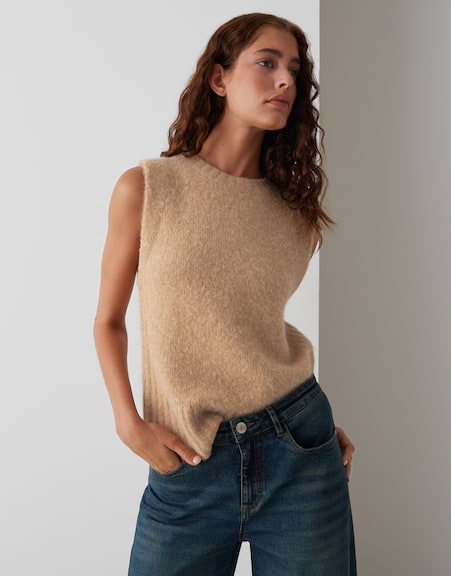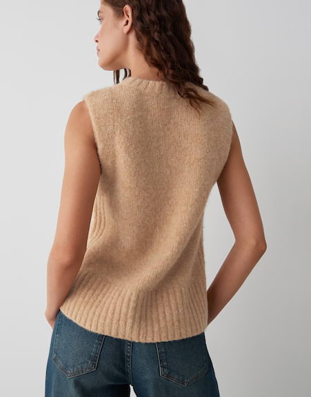 | normale Passform, gerader Schnitt, ärmellos, Rundhalsausschnitt, Rückenlänge ca. 53 cm bei Größe 36, Model Größe 177 cm ? trägt Größe 36, Feinstrick, weicher Griff, wärmend, Strickbündchen | |