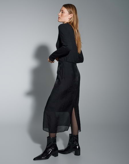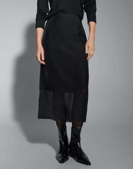 Schimmernder Organza umhüllt den Bleistiftrock und legt sich über einen blickdichten Unterrock. Mit hohem Bund und figurbetonter Silhouette avanciert er zum It-Piece moderner Abendgarderobe.
