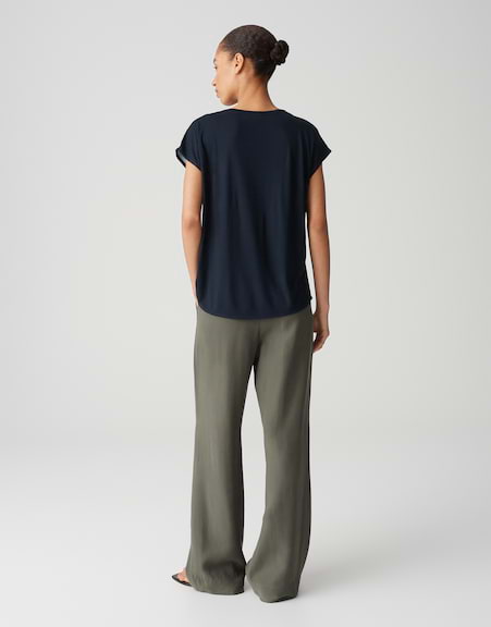 Ein Kurzarmshirt im Materialmix mit fließend bedruckter Satinfront und softem Jerseyrücken kombiniert Komfort mit modischer Leichtigkeit. Der abstrakte Streifenprint setzt dabei einen modernen Akzent.