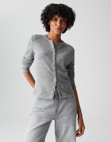 Die figurnahe Jerseyjacke interpretiert den Strickjacken-Klassiker neu und zeigt sich im modernen Button-Up Stil. Gefertigt aus soft gebrushtem Rippjersey bietet sie angenehmen Tragekomfort und wird zum vielseitigen Basic.