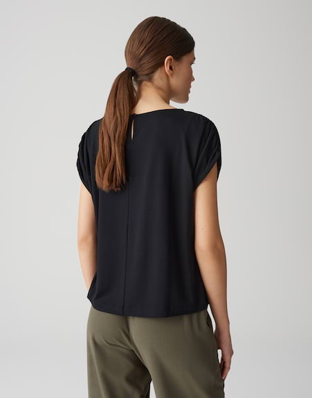 | lockere Passform, gerader Schnitt, überschnittener Kurzarm, Rundhalsausschnitt, Rückenlänge ca. 57 cm bei Größe 36, Model Größe 177 cm ? trägt Größe 36, Jersey, weicher Griff, fließender Fall, elastisches Raffdetail an der Schulter, Knopf mit Öse im Rücken | |
