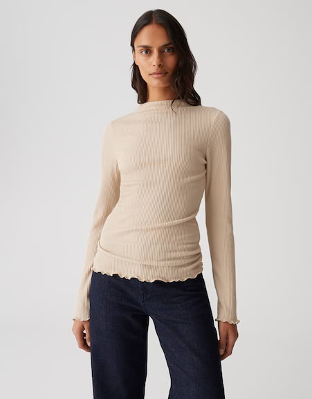 schmale Passform, figurbetont geschnitten, Langarm, Funnel Neck, Rückenlänge ca. 63 cm bei Größe 36, Model Größe 178 cm ? trägt Größe 36, Jersey, feine Rippstruktur, glatter Griff, elastischer Stoff, gewellte Kurbelkante | |