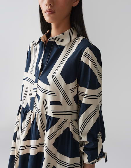 lockere Passform, A-Linie, Midi-Länge, Langarm, Hemdblusenkragen, Rückenlänge ca. 123 cm bei Größe 36, Model Größe 177 cm ? trägt Größe 36, Webware, enthält nichttextile Teile tierischen Ursprungs, natürlicher Griff, fließender Fall, grafisches Muster, verdeckte Knopfleiste, Perlmuttknöpfe, Volantstufen, Riegel an der Manschette | |
