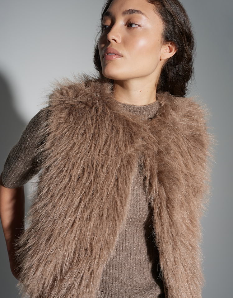 Weste aus weichem, langhaarigem Webpelz im Boho-Style verleiht jedem Outfit als Trendpiece sofort modische Präsenz. Mit Hakenverschluss und seitlichen Eingrifftaschen sorgt sie für stylischen Komfort und einen markanten Look.