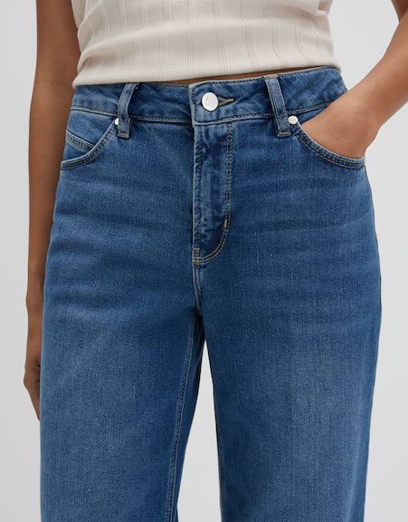 leicht ausgestelltes Bein, Beininnenlänge ca. 81 cm in jeder Größe, Model Größe 176 cm ? trägt Größe 36, Denim, weicher Griff, elastischer Stoff, Swingpockets vorne, eckige Gesäßtaschen, Bügelfalten, verdeckter Zip-Fly | |