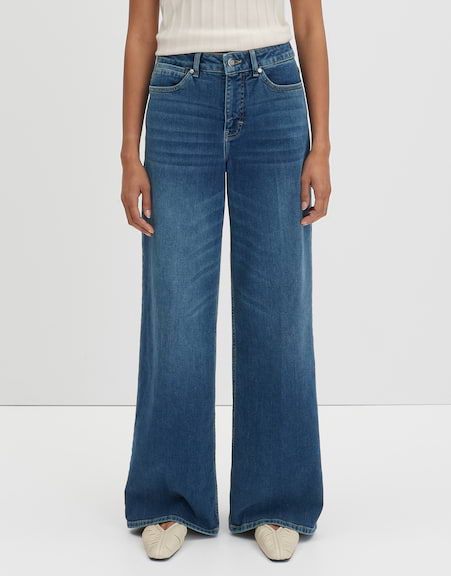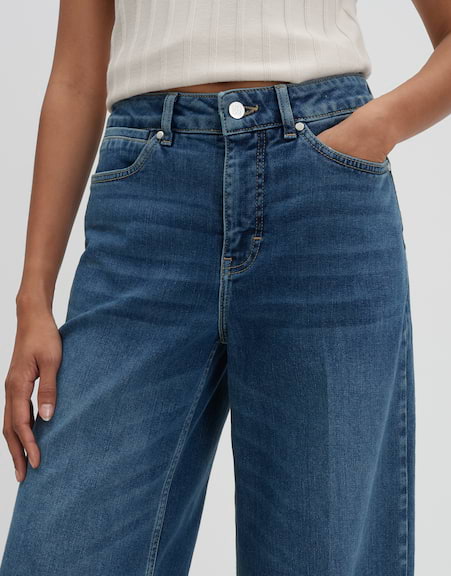 | weit am Oberschenkel, weiter, gerader Beinverlauf, Hosenbein Innenlänge ca. 80 cm in jeder Größe, Model Größe 176 cm ? trägt Größe 36, Denim, leicht elastischer Stoff, 5-Pocket-Design, Bügelfalten, verdeckter Zip-Fly Verschluss, leichte Used-Effekte, Crinkle Effekte | |