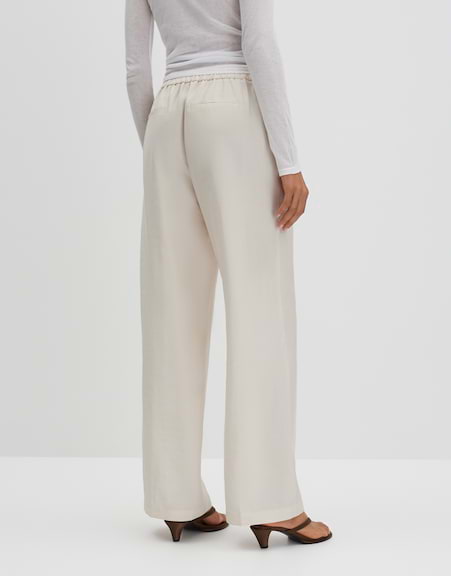 weiter, gerader Beinverlauf, Hosenbein Innenlänge ca. 78 cm in jeder Größe, Model Größe 179 cm ? trägt Größe 36, Webware, dezente Twillstruktur, glatter Griff, weich fließender Fall, pflegeleicht, französische Taschen, Zier-Paspeltaschen hinten, Gummibund hinten | |