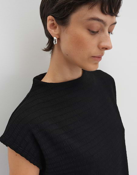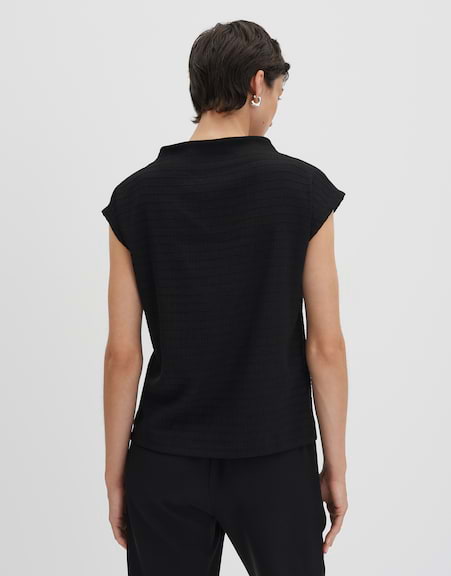 | normale Passform, gerader Schnitt, überschnittener Kurzarm, Funnel Neck, Rückenlänge ca. 56 cm bei Größe 36, Model Größe 176 cm ? trägt Größe 36, Jersey, 3-dimensionale Struktur, natürlicher Griff, elastischer Stoff, weich fließender Fall, Streifenmuster | |