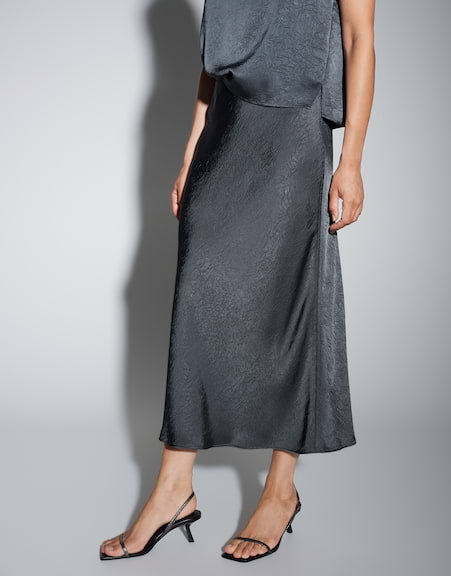 Feminine Leichtigkeit und spannender Look – der Satin-Midirock in Crash Optik, mit A-Linie und elastischem Komfortbund, bringt Stil in jede Garderobe. Perfekt für alle, die einen modernen, strahlenden Auftritt lieben.
