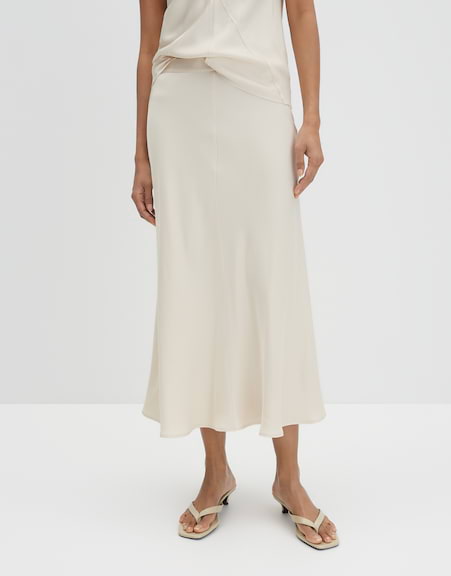 lockere Passform, leicht ausgestellt geschnitten, Midi-Länge, hintere Länge ca. 83 cm in allen Größen, Model Größe 176 cm ? trägt Größe 36, Satin, glatter Griff, schimmernde Oberfläche, weich fließender Fall, elastischer Gummibund, vordere Längsnaht | |