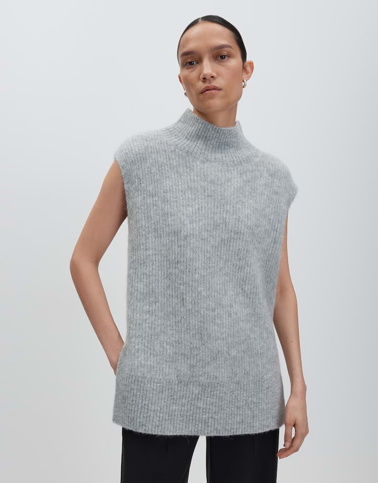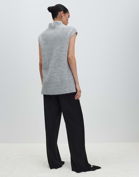 Der ärmellose Stricker aus weichem Alpakamix überzeugt mit modischem Stehkragen und flauschiger Struktur. Der figurumspielende schmale Schnitt streckt die Silhouette und verleiht jedem Look Modernität.