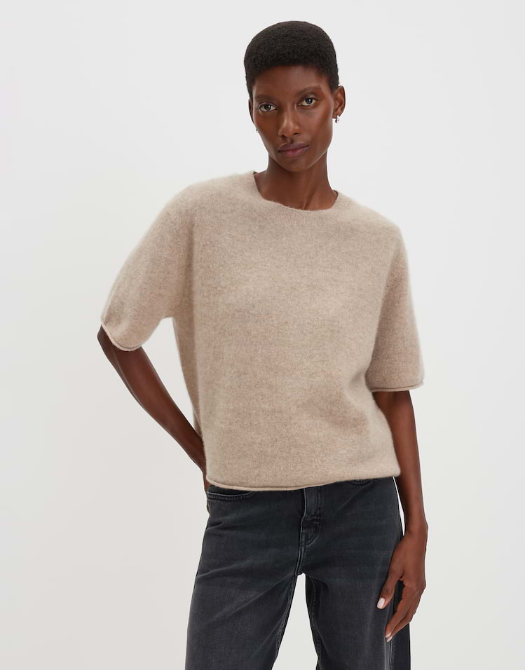 | lockere Passform, gerader Schnitt, Kurzarm, Rundhalsausschnitt, Rückenlänge ca. 54 cm bei Größe S, Model Größe 176 cm ? trägt Größe S, Feinstrick, weicher Griff, gebürstete Oberfläche, atmungsaktiv, wärmend, Rollkanten | |