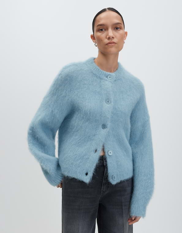 Voluminös und herrlich weich präsentiert sich dieser gebrushte Strickcardigan mit Alpakaanteil als leichter, ultrawärmender Button Up Favorit. Ideal als Sweaterersatz bringt er unkomplizierte Gemütlichkeit in jeden Alltagslook.