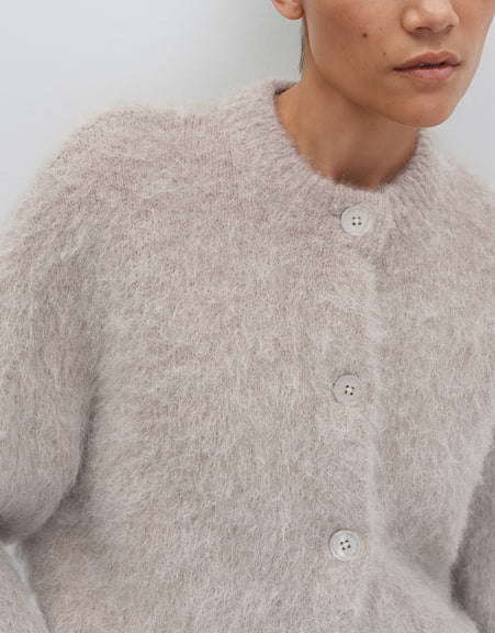 Voluminös und herrlich weich präsentiert sich dieser gebrushte Strickcardigan mit Alpakaanteil als leichter, ultrawärmender Button Up Favorit. Ideal als Sweaterersatz bringt er unkomplizierte Gemütlichkeit in jeden Alltagslook.