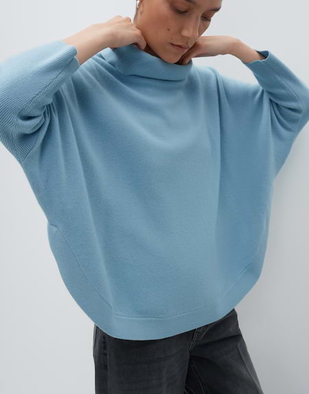 Der Feinstrickpullover in Capeform mit abgerundetem Saum und Schlitzdetail am hinteren Rollkragen überzeugt als stilvoller Begleiter für Büro oder Dinner. In Kombination mit einer schmalen Hose entsteht ein eleganter Look.