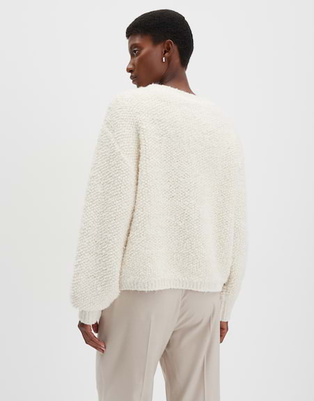 Der oval geschnittene Strickpullover überzeugt mit seiner markanten Bouclé-Struktur, die dem Design eine spannende Tiefe verleiht. Weiche Haptik, sportive Bündchen und die moderne Silhouette machen ihn zum vielseitigen Stylingpartner.