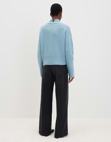 Softer Kaschmir trifft auf modernen Stehkragen mit Schlitz im Nacken. Breite Strickbündchen runden den luxuriösen Look ab, der sowohl im Büro als auch bei besonderen Anlässen stilvolle Präsenz und wohlige Wärme garantiert.