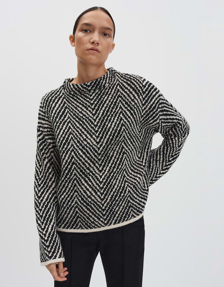 Das neue schwarz weiß Fischgrat Strickmuster macht diesen Jacquard Pullover zum stilvollen Eyecatcher. Hochwertige Qualität, moderne Passform und extra Wärme durch den Funnel Neck bieten Komfort und Trendfaktor für jeden Tag.