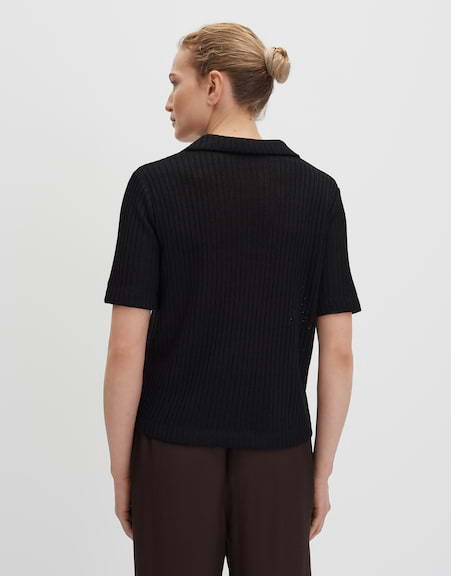 | normale Passform, gerader Schnitt, Halbarm, V-Ausschnitt, Polokragen, Rückenlänge ca. 54 cm bei Größe 36, Model Größe 178 cm ? trägt Größe 36, Sweatware, Rippstruktur, natürlicher Griff, elastischer Stoff | |