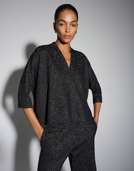 Lässiger Schnitt, funkelnde Lurex-Struktur und edler Komfort machen das Sweatshirt zum vielseitigen Allrounder. Im Duo mit der passenden Hose wird daraus ein angesagtes Ensemble für besondere Anlässe.