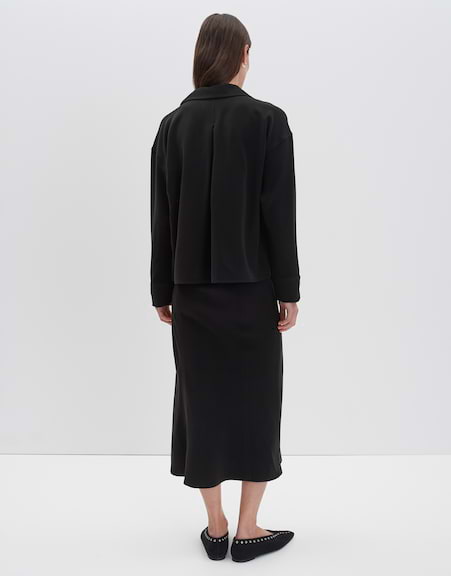 Die feminine Bluse mit Johnnykragen und weiter Silhouette umspielt leicht die Figur, während die glatte Innenseite bei jedem Tragen für ein überraschend sanftes Hautgefühl sorgt.