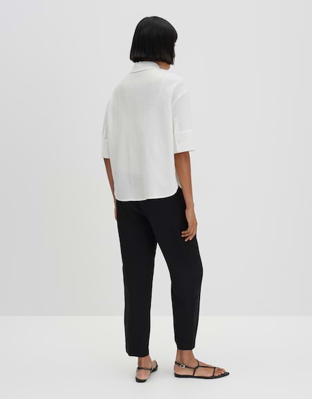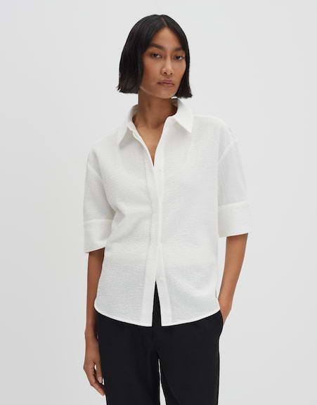 lockere Passform, Boxy Fit, überschnittene Schulter mit Halbarm, Hemdblusenkragen, Rückenlänge ca. 62 cm bei Größe 36, Model Größe 176 cm ? trägt Größe 36, Webware, Seersucker Struktur, fester Griff, formstabil, abgerundeter Saum, verdeckte Knopfleiste, klassische Manschetten | |