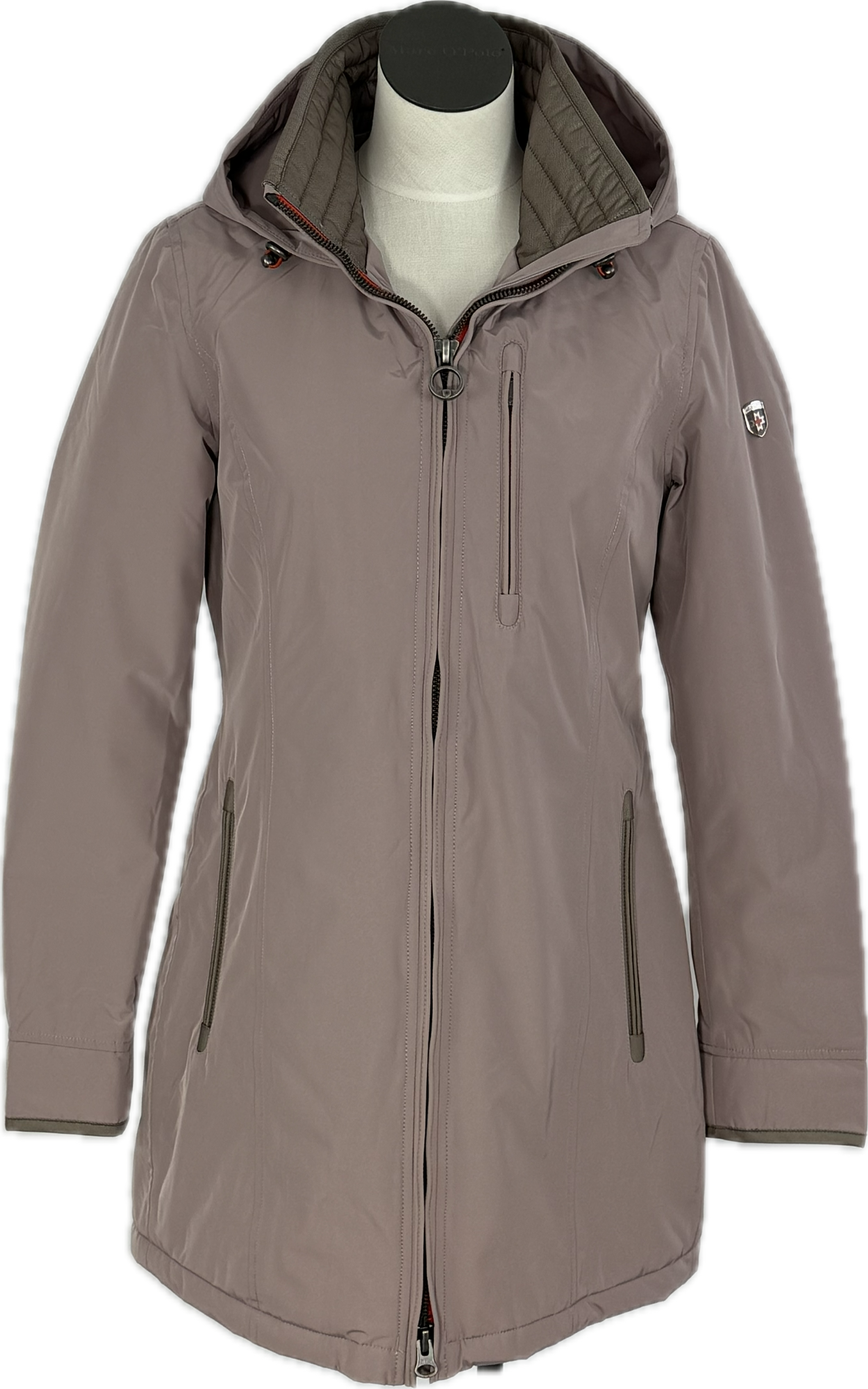 Lange, schlichte Jacke mit leichter Wattierung. Bequeme, farblich abgesetzte paspelierte Taschen mit Zippern lassen persönliche Utensilien sicher und praktisch überall dabei sein. Gleichfarbige Paspeln an den Ärmeln runden das Bild ab. Kleiner Farbtupfer: Die Kordeln an der Kapuze sind orange. Stockholm ist die perfekte Jacke für eine Tour im Wald oder am Strand. Eine wärmende Kapuze schützt vor Wind und Wetter.